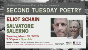 Join the regulars at Bookish Modesto as we welcome Eliot Schain of Berkeley and Modesto Poet Laureate Emeritus Salvatore Salerno as our featured poets. Date: Tuesday, March 10, 2026Time: 7:00 pm PSTWhere: Bookish Modesto, 811 W. Roseburg Ave, in the Roseburg Square shopping center Open mic following featured poets (3 min per poet); sign up …