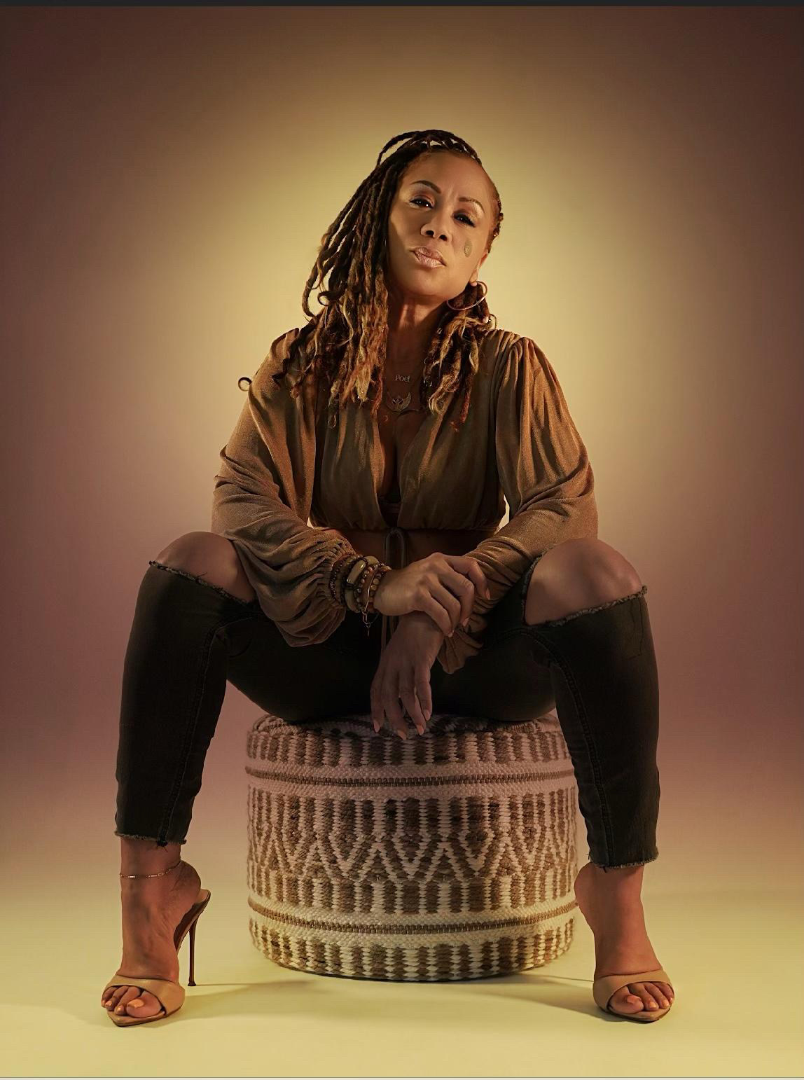 Poet Angela Drew sitting on chair with dramatic backlighting