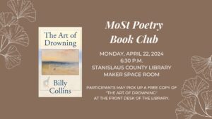 Join host Salvatore Salerno for a discussion of The Art of Drowning by Billy Collins, U.S. Poet Laureate Emeritus. MoSt Book Club will meet Monday, April 22, 2024 at 6:30 p.m. in the Maker Space of the Stanislaus County Library, 1500 I Street, Modesto CA. Participants may pick up a free copy of The Art …