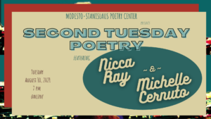 The Modesto-Stanislaus Poetry Center features authors Nicca Ray and Michelle Cernuto for the August installment of Second Tuesday Poetry. Join us for a great mix of poetry, ghost fiction, and punk rock memoir on Tuesday, August 10 at 7 pm on Zooom. Hosted by Stella Beratlis with open mic following the featured readers. Zoom: https://cccconfer.zoom.us/j/91909197367 Open …